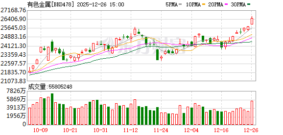 消息方面,年末有色金属市场掀起涨价狂潮,12月26日早盘,黄金、白银、铜齐创新高:COMEX黄金最高涨至4561.6美元/盎司,创历史新高;COMEX白银最高涨至75.495美元/盎司,同样创下历史新高;COMEX铜最高涨至5.7565美元/磅,创今年7月以来的新高,距历史最高点5.9585美元/磅仅需再涨3.5%。