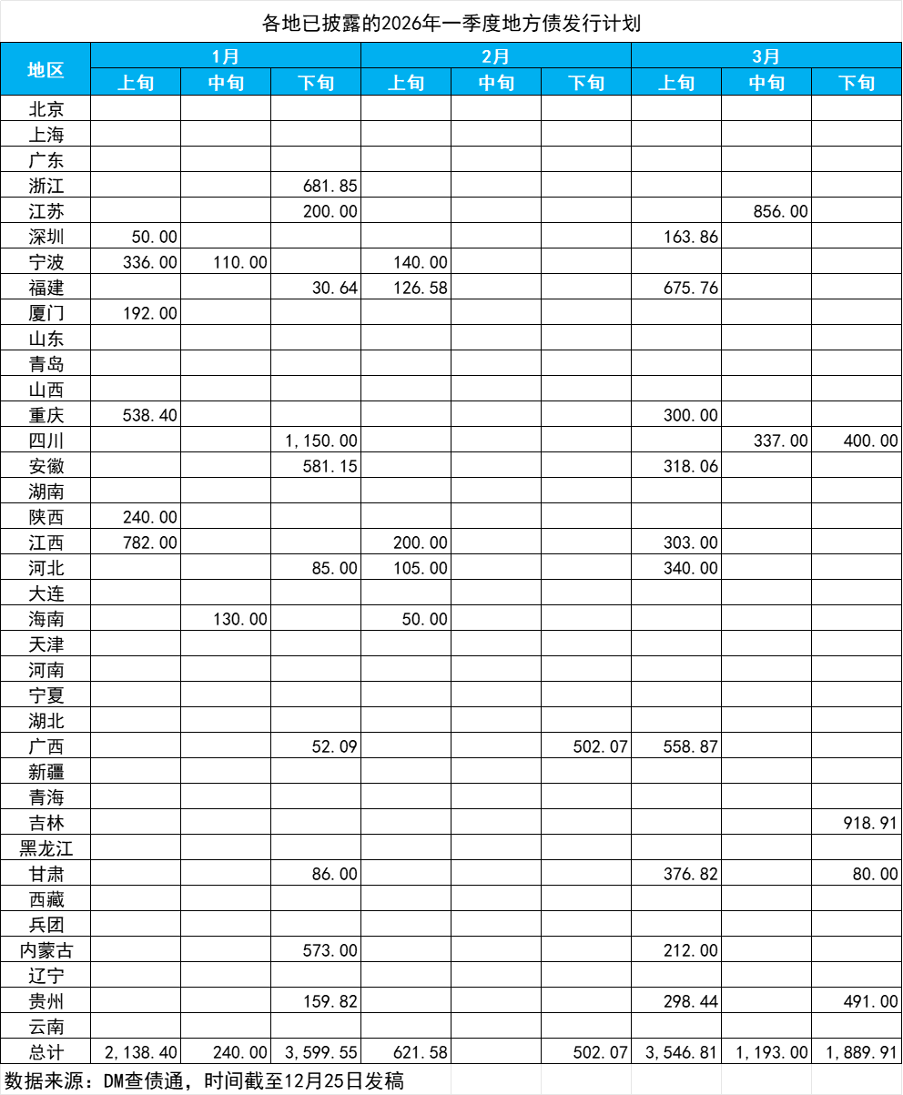 记者注意到,自12月16日四川率先公布明年一季度地方政府债券发行计划以来,江苏、江西、重庆、甘肃、内蒙古、吉林、河北、宁波等地相继跟进披露,形成了一波集中披露热潮,标志着2026年地方政府债券发行工作或已提前“拉开序幕”。