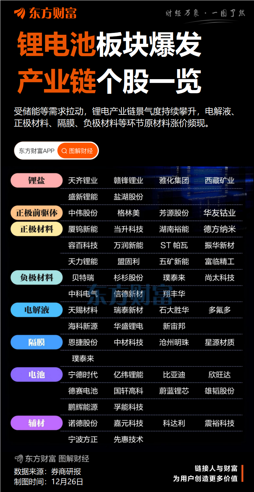 12月26日开盘,锂电池板块大涨,丰元股份、天际股份竞价涨停,华盛锂电涨超12%,湖南裕能、龙蟠科技、金圆股份等跟涨,比亚迪一度大涨超6%,长城汽车、海马汽车等集体拉升。