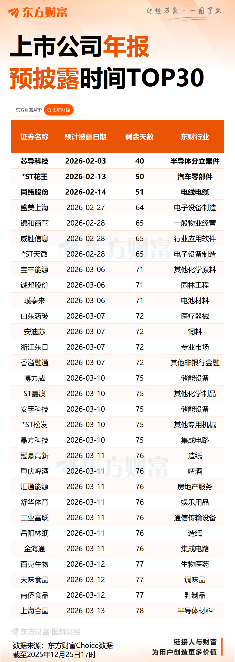 12月25日,沪市公司2025年年报预约披露时间表出炉。其中,科创板公司芯导科技(688230)拔得头筹,将于2026年2月3日披露年报。沪市主板的首份年报则由*ST花王于2月13日发布。尚纬股份、盛美上海、威胜信息等公司都排在预约时间表的前列。