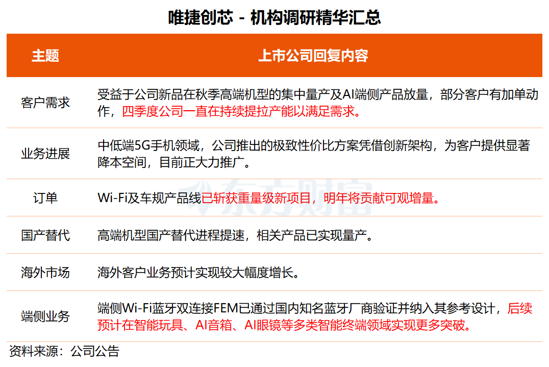 在调研中,唯捷创芯表示,受益于公司新品在秋季高端机型的集中量产及AI端侧产品放量,部分客户反而有加单动作,四季度公司一直在持续提升产能以满足需求。