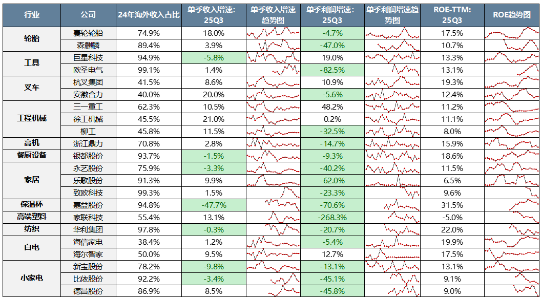 那么当前出口链基本面位置如何?海外市占率相关链条以α为主、较散,但全球制造业PMI挂钩链条有一定共性。截至25Q3,在关税、美国需求等扰动下,多数已走过扩张阶段,步入出清初期,等待困境反转。