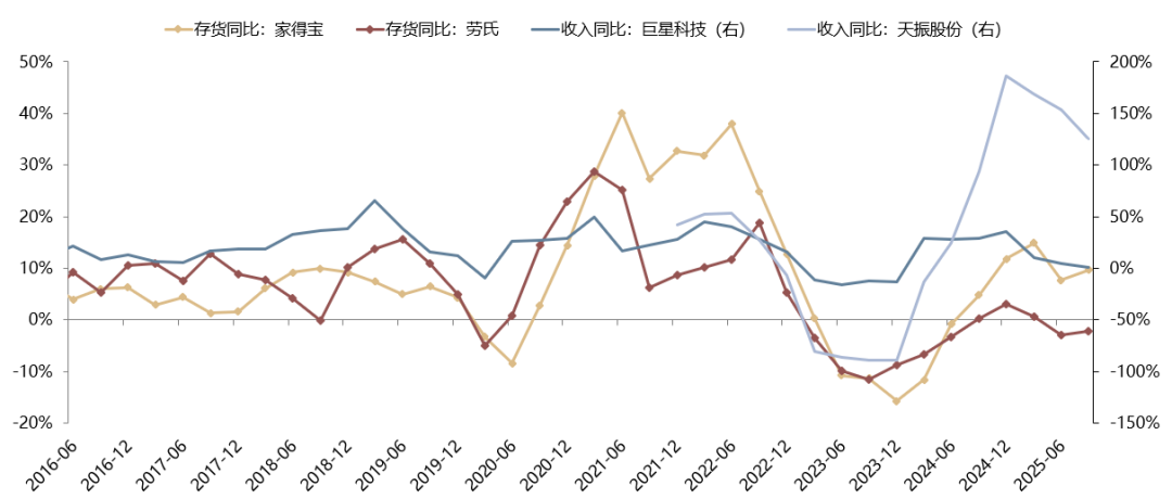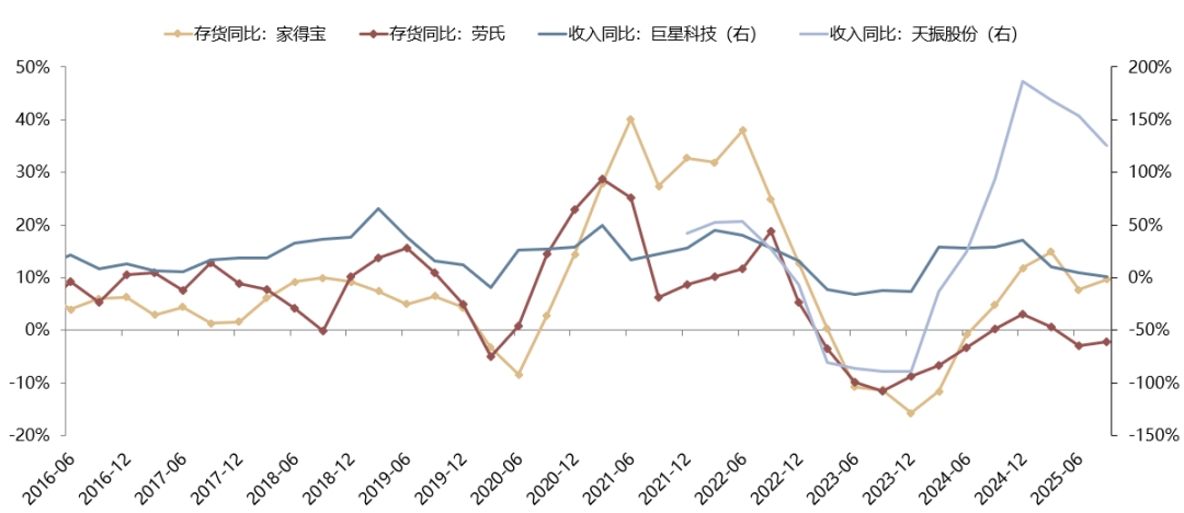 在此基础上,当前美国渠道商库存位于历史偏低位置,如果地产复苏形成补库,可能会对国内出口公司的业绩形成拉动。历史来看,国内对美地产类龙头的收入增速,与家得宝、劳氏的补库周期基本同节奏。