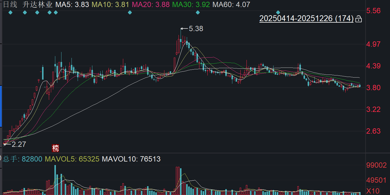 二级市场上,截至12月26日收盘,升达林业下跌1.30%报3.81元/股,总市值约28.66亿元,今年来公司股价累计上涨超六成。