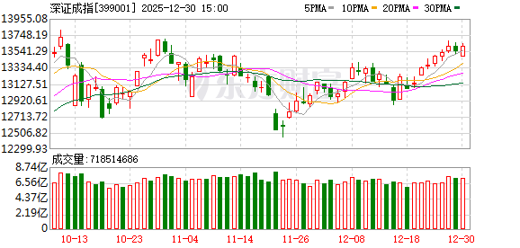 A股三大指数今日涨跌不一,沪指日线九连阳。截止收盘,沪指涨0.04%,收报3965.28点;深证成指跌0.49%,收报13537.10点;创业板指跌0.66%,收报3222.61点。沪深两市成交额21393亿,较上一交易日小幅缩量209亿。