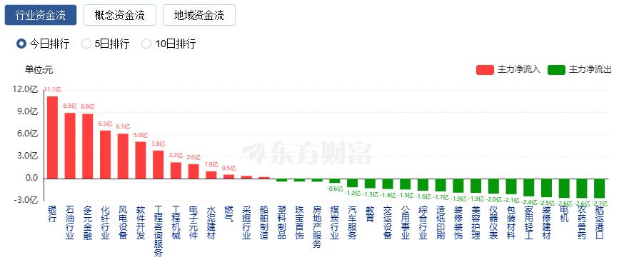 行业资金方面,截至收盘,银行、石油行业、多元金融等净流入排名靠前,其中银行净流入11.14亿。