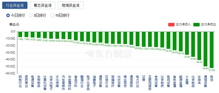 净流出方面,电池、通信设备、半导体等净流出排名靠前,其中电池净流出51.91亿元。