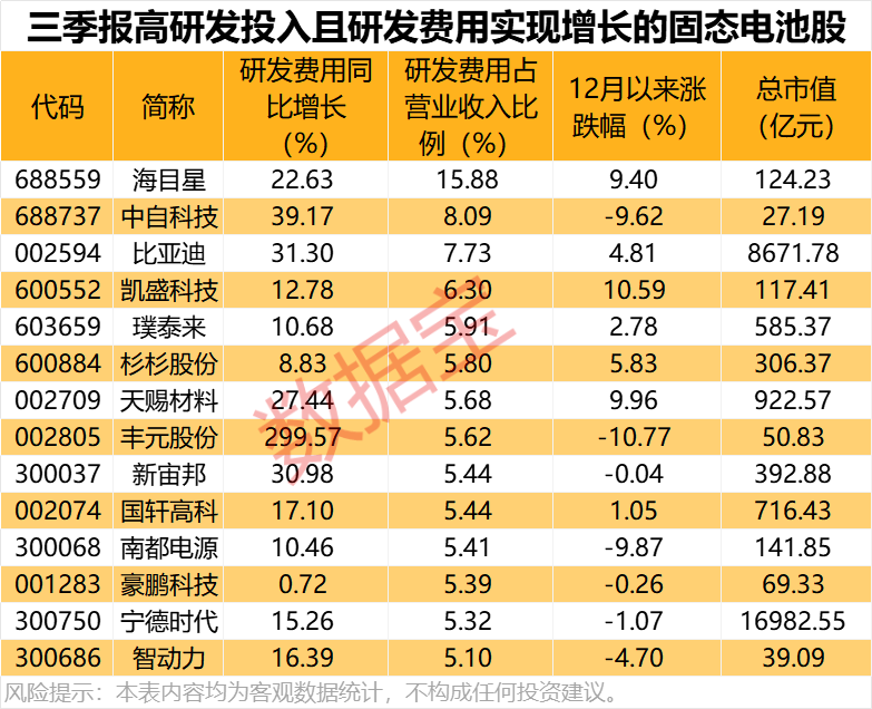 部分固态电池概念股持续重视研发投入,统计显示,三季报研发费用同比实现增长的固态电池概念股中,14股研发费用占营业收入比例超过5%,约占总数的四分之一。其中,海目星、中自科技、比亚迪研发费用占营业收入比例居前,分别为15.88%、8.09%、7.73%。