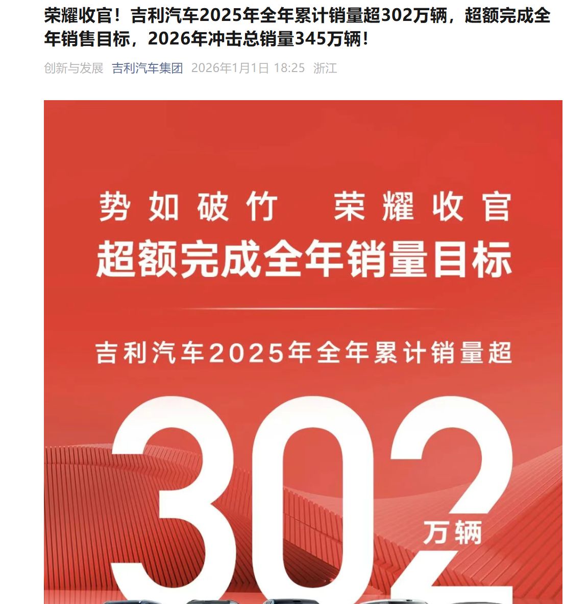 吉利汽车称,于2025年12月的汽车总销量为236,817部,较去年同期增长约13%;2025年全年汽车总销量为3,024,567部,较去年同期增长约39%,并超额完成全年销量目标3,000,000部。