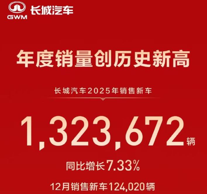 长城汽车称,2025年销售新车132.37万辆,同比增长 7.33%,再创历史新高,新能源车型销售 40.37 万辆,同比增长 25.44%,海外销售 50.61 万辆,同比增长11.68%,新能源车型及海外销量均刷新纪录。其中,2025年12月销量12.4万辆。