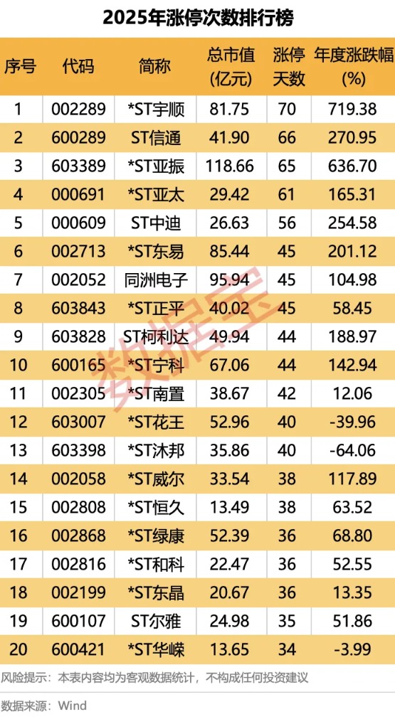 涨停方面,*ST宇顺、ST信通、*ST亚振、*ST亚太、ST中迪排名前五,全年涨停次数均在50次以上。