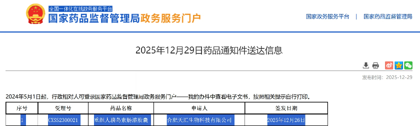 12月29日,国家药监局官网显示,合肥天汇生物的重组人胰岛素肠溶胶囊(ORMD-0801)位列当日药品通知件送达信息列表。这意味着该药物未能成功获批。