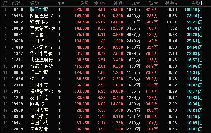 百度因宣布分拆旗下AI芯片公司昆仑芯赴港上市,股价涨超9%,知情人士透露称“出货量排国产前三”,高盛认为,如果参考寒武纪目前的市销率倍数,百度股权值30-110亿美元。;网易涨超6%,美的、中芯国际涨超5%,阿里、腾讯涨超4%。