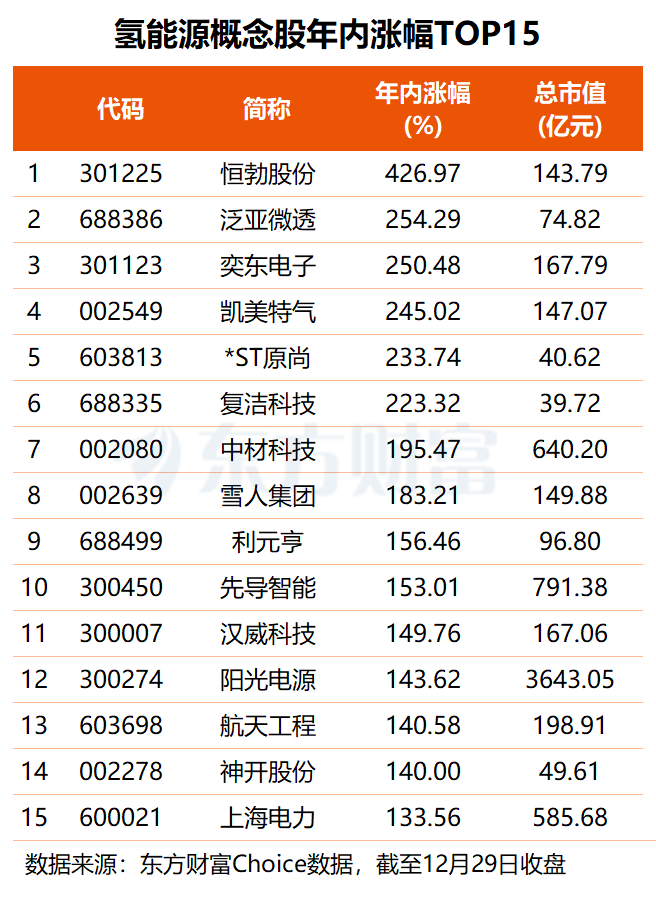 超八成氢能源概念股今年股价录得上涨,有31股股价涨超1倍,恒勃股份以427%的累计涨幅居首,奕东电子、凯美特气等5股区间涨幅均超2倍。