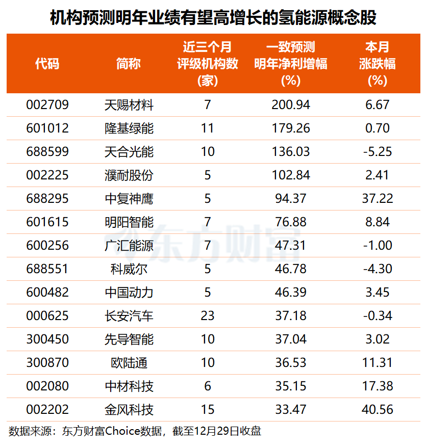 东方财富Choice数据显示,近3个月以来,共有46只氢能源概念股获得5家及以上机构评级,长城汽车、长安汽车、宝丰能源均获超20家机构重点关注,阳光电源、九丰能源、金风科技、兴发集团、隆基绿能、兴发集团等11股也有十家以上机构给予投资评级。