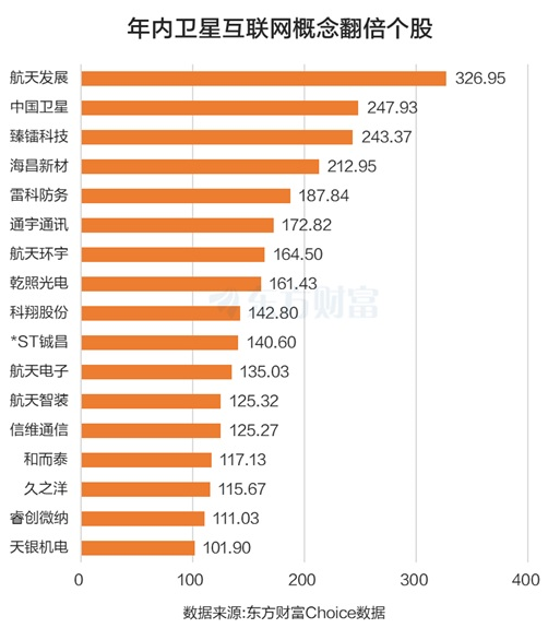 在这样的背景下,年内卫星互联网板块颇受资本市场青睐。截至12月31日早盘结束(以下同),卫星互联网概念指数年内上涨67.52%,同期沪深300指数上涨17.68%。个股而言,航天发展成为卫星互联网板块的“涨幅王”,年内涨幅326.95%。中国卫星紧随其后,年内上涨247.93%。臻镭科技、海昌新材、雷科防务等也涨幅靠前。