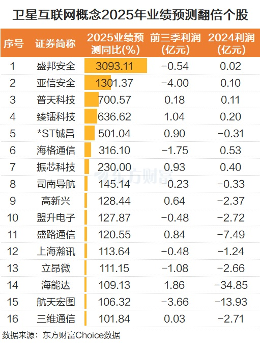 业绩角度来看,部分卫星互联网概念2025年机构预测高增长,16股预计业绩同比翻倍。盛邦安全业绩预测同比增幅居首,为3093.11%。亚信安全紧随其后,预测同比增幅为1301.37%。普天科技、臻镭科技、*ST铖昌等业绩预测同比增幅也靠前。