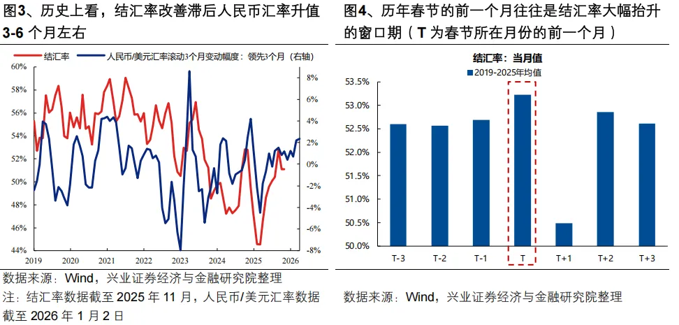 并且,前期人民币升值为流动性和风险偏好创造的偏暖环境,在1月仍有进一步演绎的空间,汇率市场与资本市场的春季躁动行情有望形成共振。一方面,历史上结汇率改善滞后人民币汇率升值3-6个月左右,随着近期人民币加速升值,未来一个季度滞后的结汇需求有望渐次释放。另一方面,从季节效应上看,历年春节的前一个月往往是结汇率大幅抬升的窗口期,1月有望看到结汇率的进一步改善,继续为年初人民币汇率走强提供助力。人民币升值带动的国内待结汇资金和境外资金的回流,为国内企业、居民部门和外资提供入市增量资金,有望成为春季行情的潜在流动性来源。