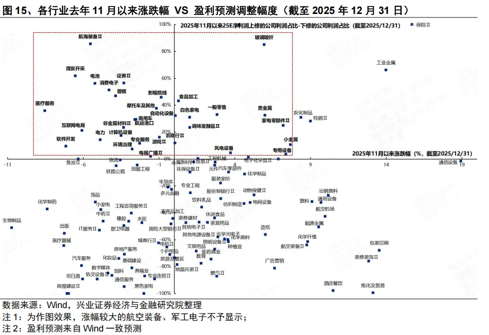 其中,去年11月以来涨幅偏低的行业主要包括:AI上游算力(半导体、元件)、AI中下游(消费电子、游戏、软件等)、新能源(电池、光伏设备、风电设备)、机器人链(自动化设备、家电零部件)、汽车(摩托车、商用车)、周期(煤炭开采、普钢、非金属材料、玻璃玻纤)、消费(互联网电商、白电、零售等)、券商等。