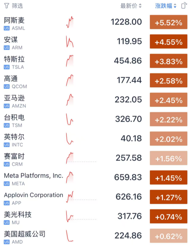 芯片股领涨,阿斯麦股价刷新记录新高,日内涨幅超5%,台积电股价大涨,此前高盛分析师将其目标价上调了35%。