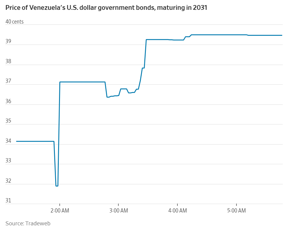 委内瑞拉方面,政府及国有石油公司PdVSA(委内瑞拉国家石油公司)发行的国际债券集体走强。投资者押注,特朗普政府抓捕马杜罗将为委内瑞拉主权债务重组扫清障碍。委内瑞拉政府在2017年因美国对马杜罗政权实施制裁而发生债务违约。