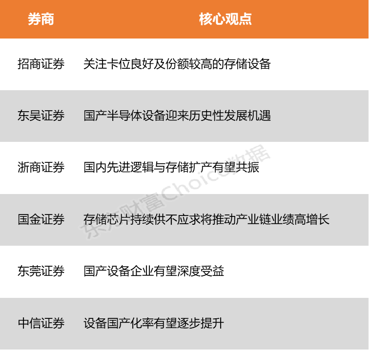 招商证券表示,长鑫IPO募投拉动产能升级,受益于国内存储原厂扩产,关注卡位良好及份额较高的存储设备。设备公司正处于景气上行周期,订单持续向好,同时头部公司不断放量,国产化率持续提升。东吴证券指出,在先进制程持续扩产与设备国产化率不断提升背景下,国产半导体设备迎来历史性发展机遇,预计新签订单增速有望超过30%,甚至达到50%以上,前道设备如刻蚀、薄膜沉积,后道测试及先进封装环节均将显著受益。