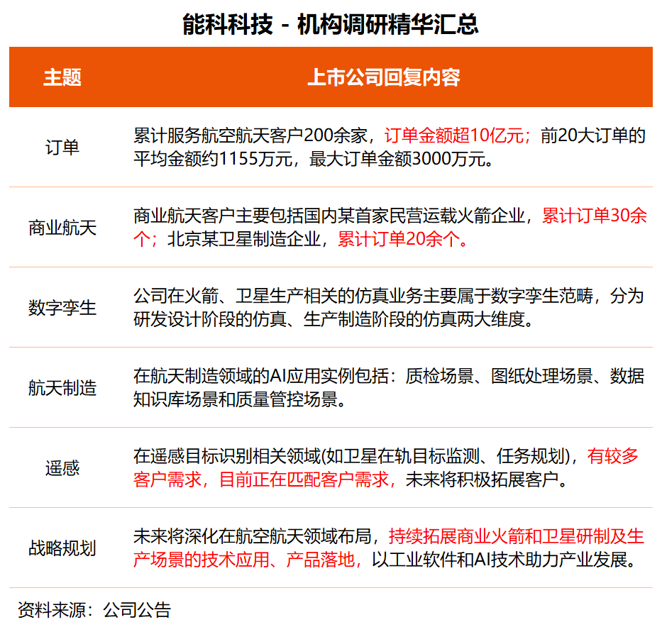 能科科技近日接受中泰证券、西部证券、易方达基金等多家机构调研。公司在调研中透露,截至目前,公司累计服务航空航天客户200余家,涉及订单500余个,订单金额超10亿元;前20大订单平均金额约1155万元,最大订单金额3000万元。其中商业航天客户主要包括国内某首家民营运载火箭企业,累计订单30余个;北京某卫星制造企业,累计订单20余个。