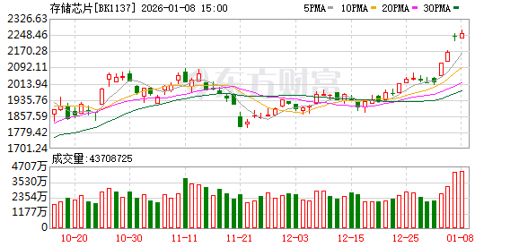 隔夜美股存储芯片板块同样大爆发,相关概念股集体大涨创新高,其中,闪迪涨超27%,开年三个交易日累涨约47%;美光科技涨10%,西部数据涨近17%,希捷科技涨14%。