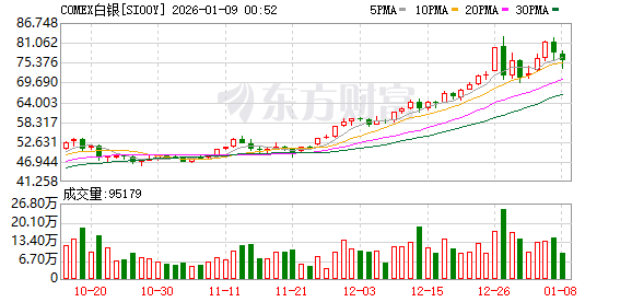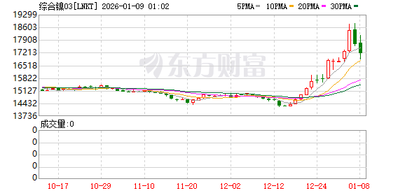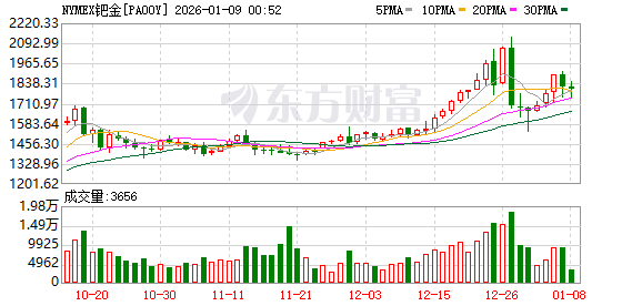 商品市场:COMEX黄金期货当月连续合约上涨54.20美元,涨幅1.22%,报4505.7美元/盎司。COMEX白银期货当月连续合约上涨4.563美元,涨幅5.95%,报81.22美元/盎司。现货白银上涨4.64美元,涨幅6.06%,报81.25美元/盎司。COMEX铂金期货当月连续合约上涨170.8美元,涨幅7.47%,报2456美元/盎司。COMEX钯金期货当月连续合约上涨126.4美元,涨幅7.16%,报1892美元/盎司。伦镍上涨1427美元,涨幅8.39%,报18430美元/吨。国际油价01月06日下跌。截至当天收盘,纽约商品交易所WTI原油期货当月连续合约下跌1.35美元,收于每桶56.97美元,跌幅为2.31%。