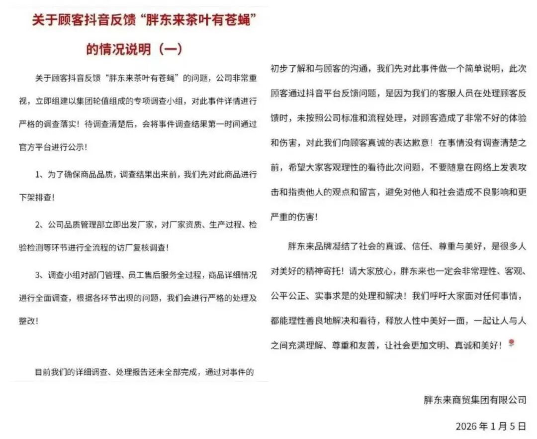 1月5日下午,胖东来在其官方抖音账号发布《关于顾客抖音反馈“胖东来茶叶有苍蝇”的情况说明(一)》(以下简称说明)。说明称,胖东来将对此事件详情进行严格的调查落实,调查结果出来前,先对此商品进行下架排查,并就对顾客造成不好的体验和伤害致歉。