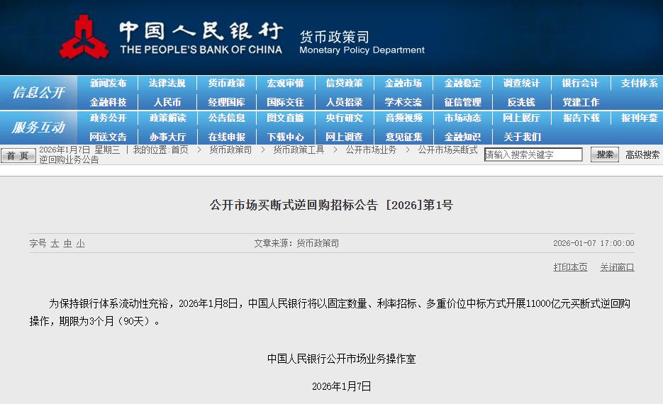 中国人民银行1月7日公布的公开市场买断式逆回购招标公告( 第1号)显示,为保持银行体系流动性充裕,2026年1月8日,中国人民银行将以固定数量、利率招标、多重价位中标方式开展11000亿元买断式逆回购操作,期限为3个月(90天)。