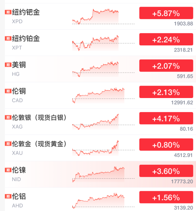 贵金属方面,全线暴涨。现货白银突破80美元/盎司,日内涨4%。