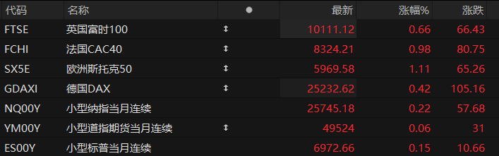 周五盘前,美股三大股指期货齐涨,欧洲主要指数普遍上涨。截至发稿,纳斯达克100指数期货涨0.22%,道指期货涨0.06%,标普500指数期货涨0.15%。