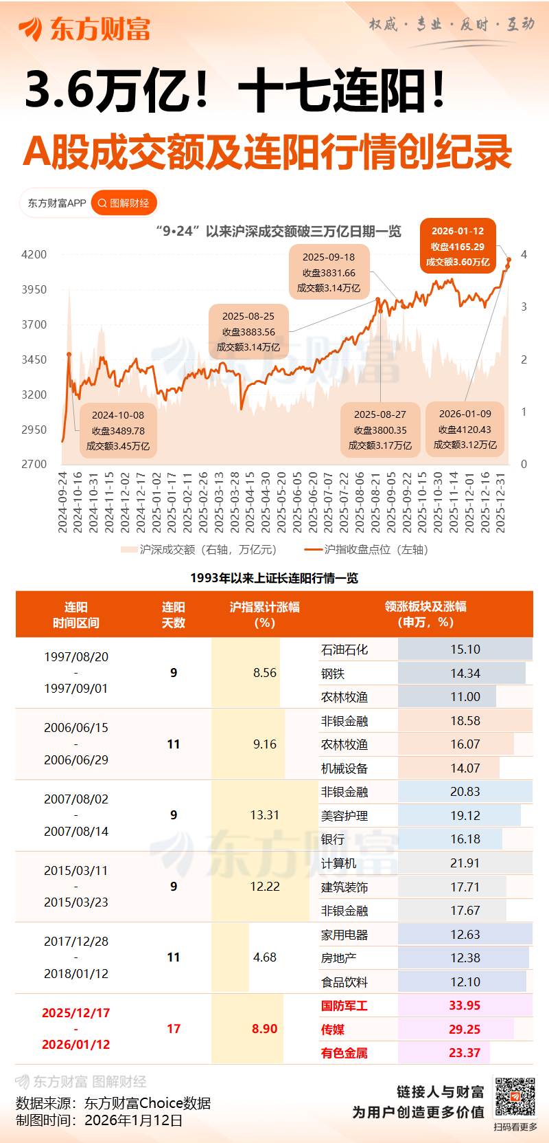 A股三大指数今日继续强势表现,沪指日线17连阳再创逾十年新高。截止收盘,沪指涨1.09%,收报4165.29点;深证成指涨1.75%,收报14366.91点;创业板指涨1.82%,收报3388.34点。沪深京三市成交额达到36450亿,较上一交易日大幅放量近5000亿,创A股历史最大成交量。