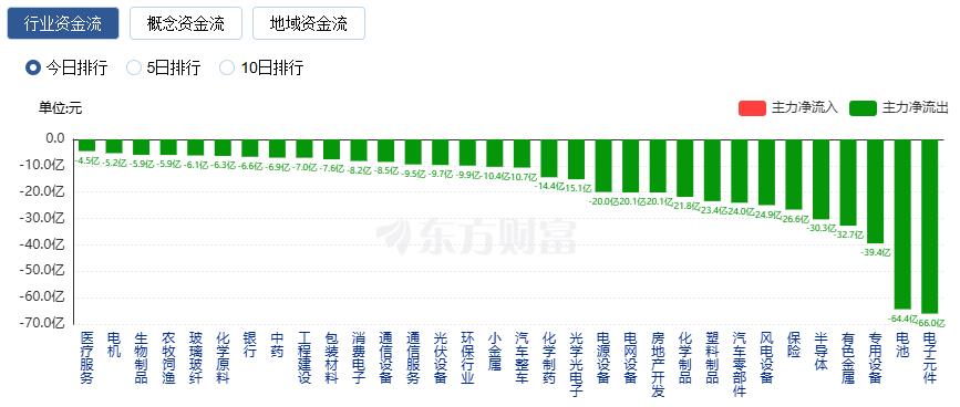 净流出方面,电子元件、电池、专用设备等净流出排名靠前,其中电子元件净流出66.05亿元。