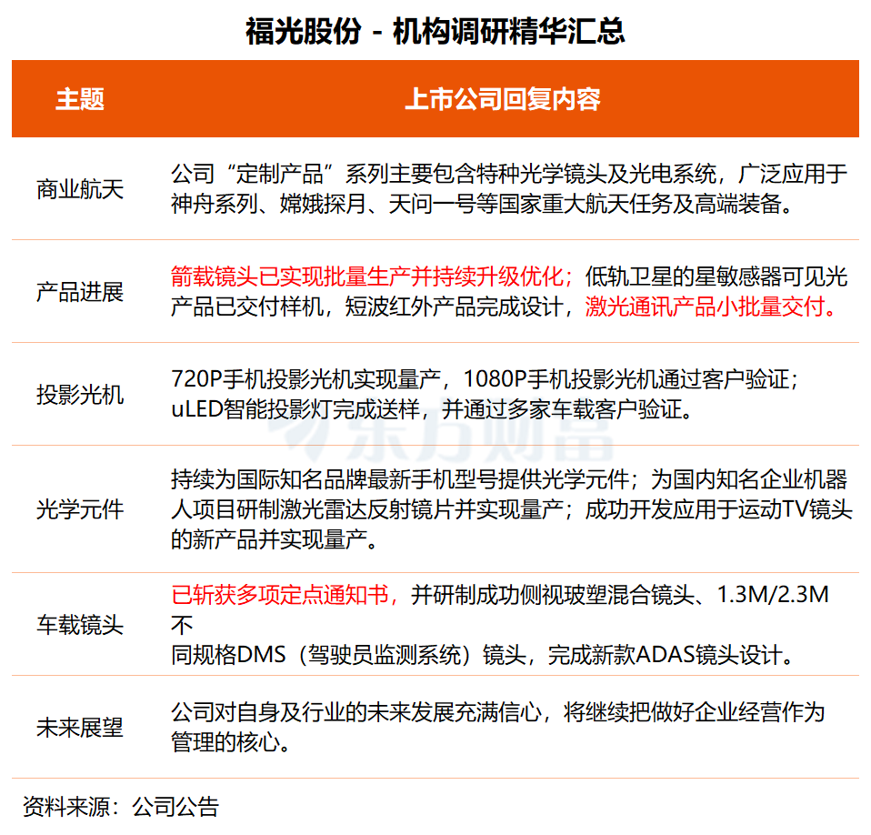 据福光股份介绍,公司特种光学镜头及光电系统广泛应用于“神舟系列”“嫦娥探月”“天问一号”等国家重大航天任务及高端装备,核心客户涵盖中科院及各大集团下属科研院所、企业。
