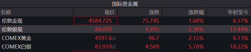 白银同步飙升。白银现货站上84美元/盎司,涨幅超5.5%,再创历史新高。截至发稿,伦敦银现报84.059美元/盎司,日内涨5.38%,年初至今已涨17.44%;COMEX白银报83.91美元/盎司,日内涨5.576%,年初至今已涨18.22%。