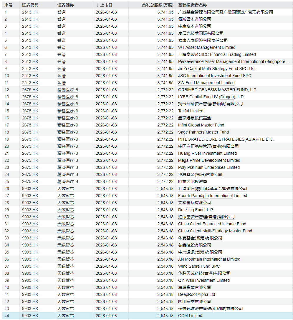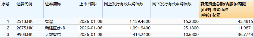 在本次上市的智谱、天数智芯以及精锋医疗-B之外,1月9日还将迎来MINIMAX-WP、金浔资源、瑞博生物这3家公司上市,而在1月12日和和13日,分别还有豪威集团、兆易创新、BBSB INTL、红星冷链这4家公司上市。