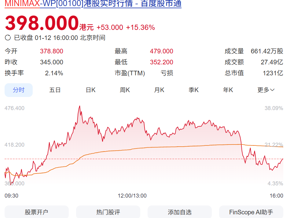 MiniMax最高涨至每股479港元,涨幅约15%-31%,收盘价每股378港元,总市值约1231亿港元。