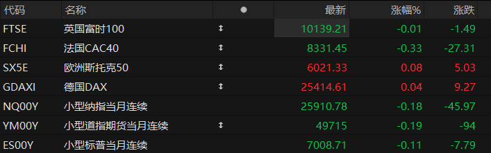 周二盘前,美股三大股指期货齐跌,欧洲主要指数涨跌不一。截至发稿,纳斯达克100指数期货跌0.18%,道指期货跌0.19%,标普500指数期货跌0.11%。
