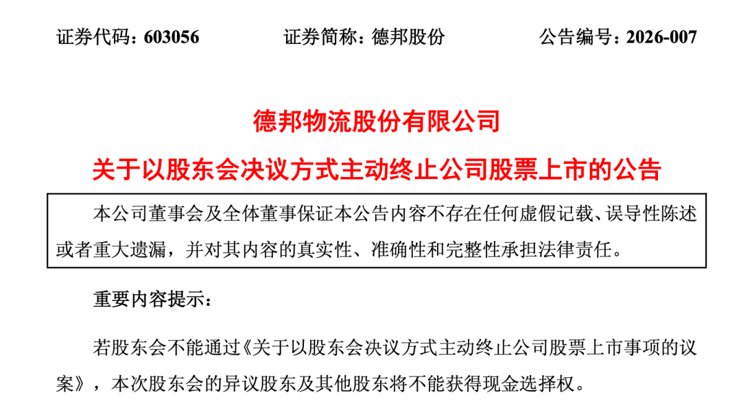 1月13日晚间,德邦股份(603056)停牌谜底揭晓:公司拟主动终止在A股上市。公司将为异议股东提供现金选择权,行权价格比该股停牌前的价格高。