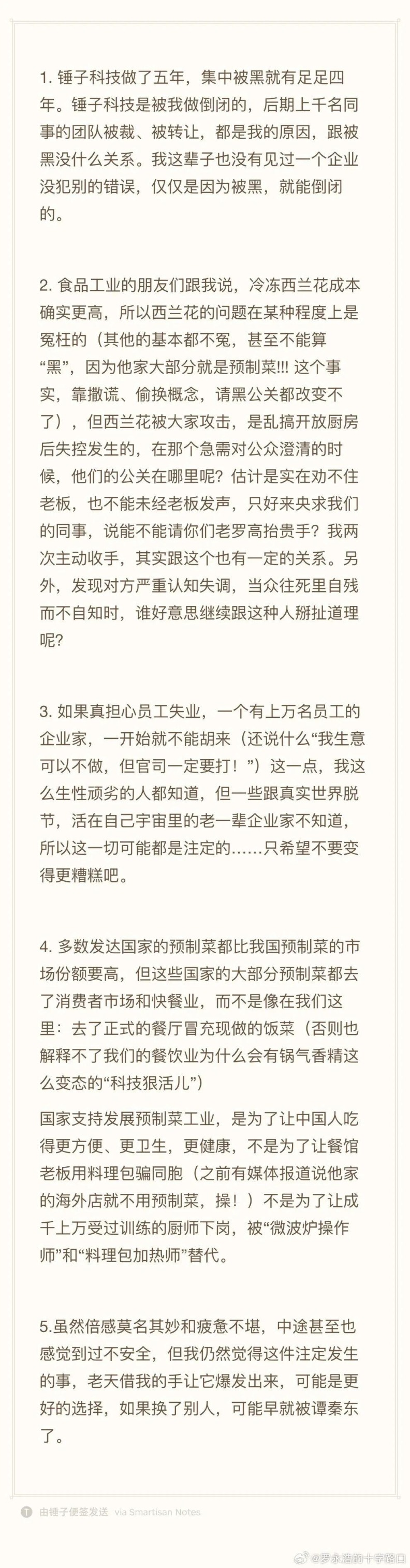 1月16日,@罗永浩的十字路口发文谈西贝近期闭店风波: