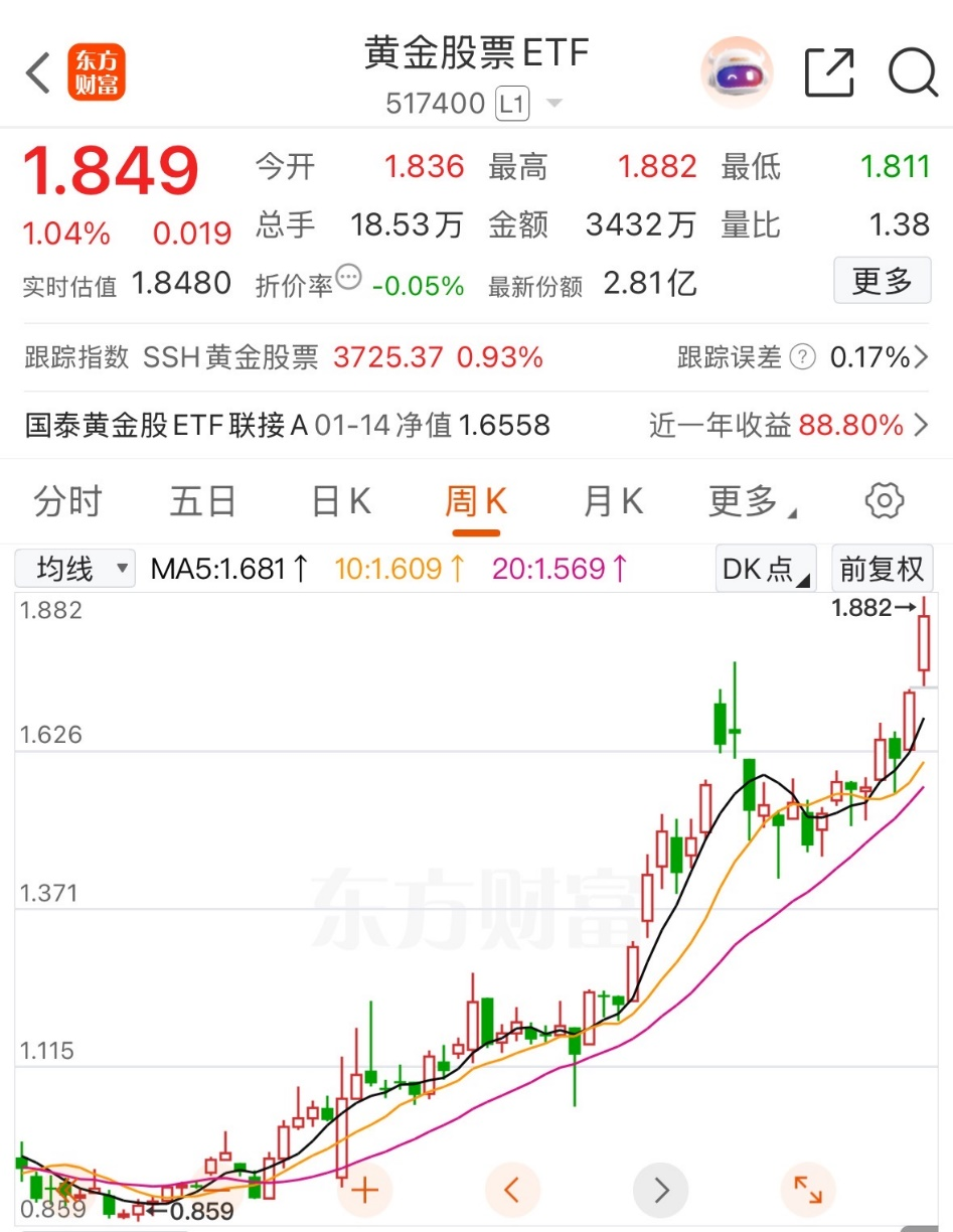 黄金股票ETF(517400)跟踪SSH黄金股票指数,覆盖沪深港黄金采掘、冶炼等全产业链50只个股,行业集中度高。作为权益类资产弹性较高,近期随金价走强成交量放大,年内涨幅显著,适合追求黄金板块进阶收益的投资者。