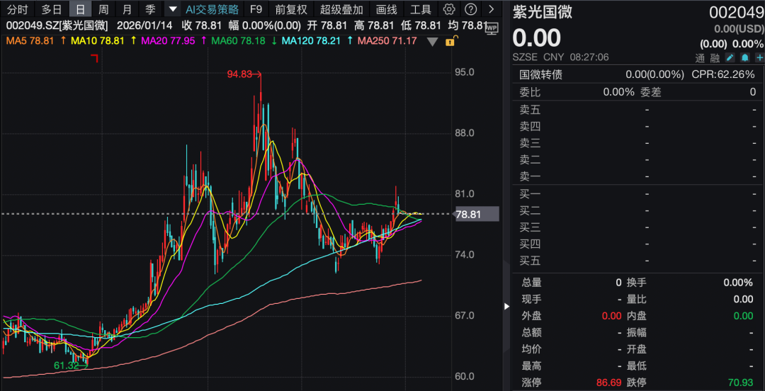 紫光国微此前于2025年12月30日(星期二)开市起停牌。停牌前公司收盘价为78.81元/股,市值约670亿元。交易预案披露后,紫光国微股票将自1月15日开市起复牌。