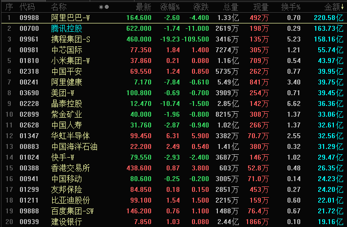 港股成交额前二十