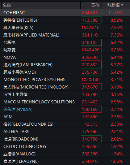 芯片股普涨,费城半导体指数大涨超3%。个股方面,COHERENT大涨超11%,英特格大涨近9%,科天半导体、应用材料大涨超7%,台积电、阿斯麦等涨超6%,拉姆研究、超威半导体涨超5%,英伟达、ARM、博通等涨超2%。