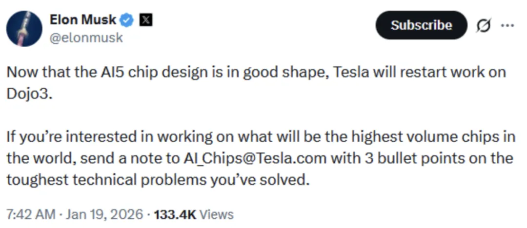 1月19日消息,马斯克在社交平台X上发帖称,随着AI5芯片设计完成,特斯拉将重启超级计算机项目Dojo 3的开发。
