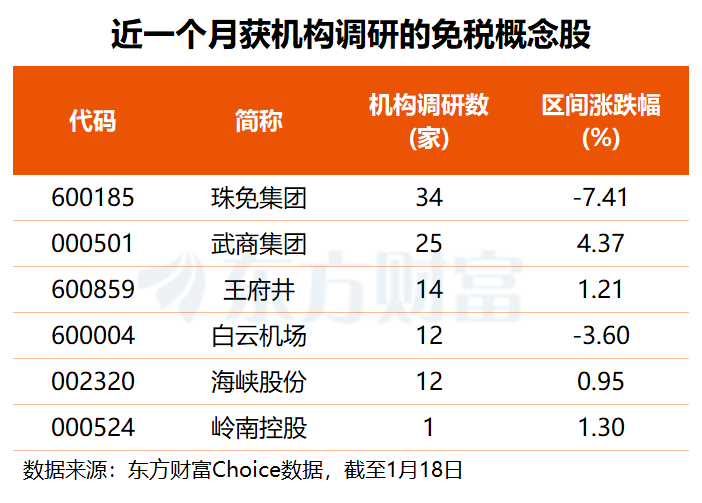 机构关注度方面,近一个月,共有6只免税概念股获得机构调研,其中,珠免集团共获34家机构集中调研,武商集团获得25家机构关注,王府井、白云机场、海峡股份机构调研数均在10家以上。