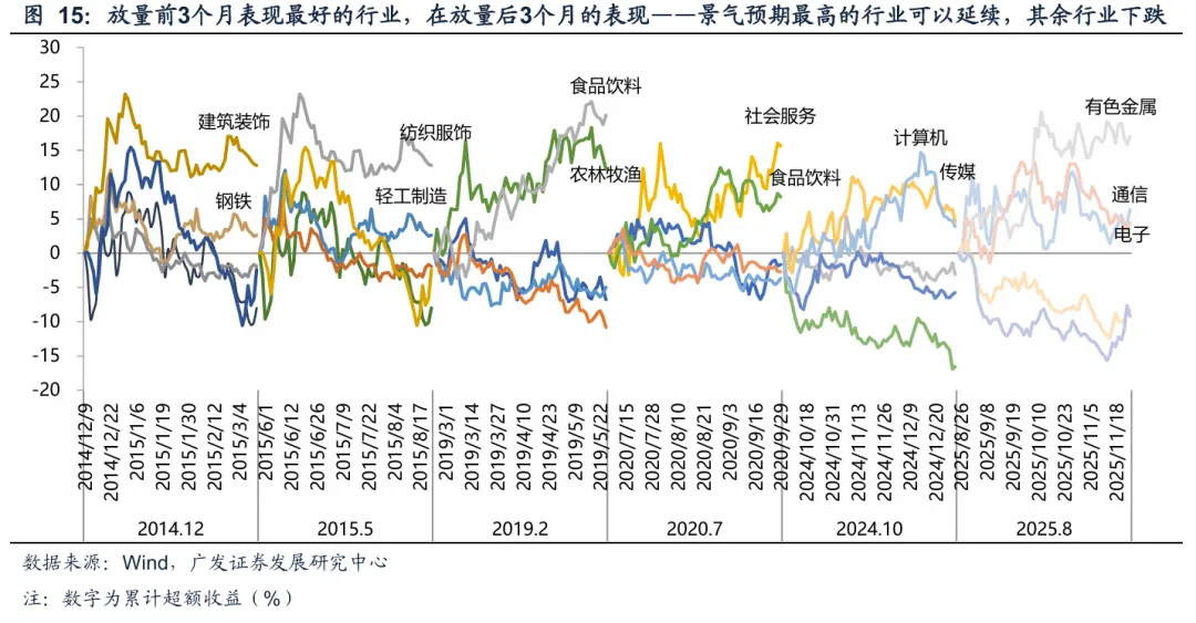 能够在放量前后、延续强势的行业,均对应着基本面预期最强劲、产业逻辑最过硬的方向(14年一带一路建筑,19年消费龙头,20年社服免税,25年AI和有色,等等)。