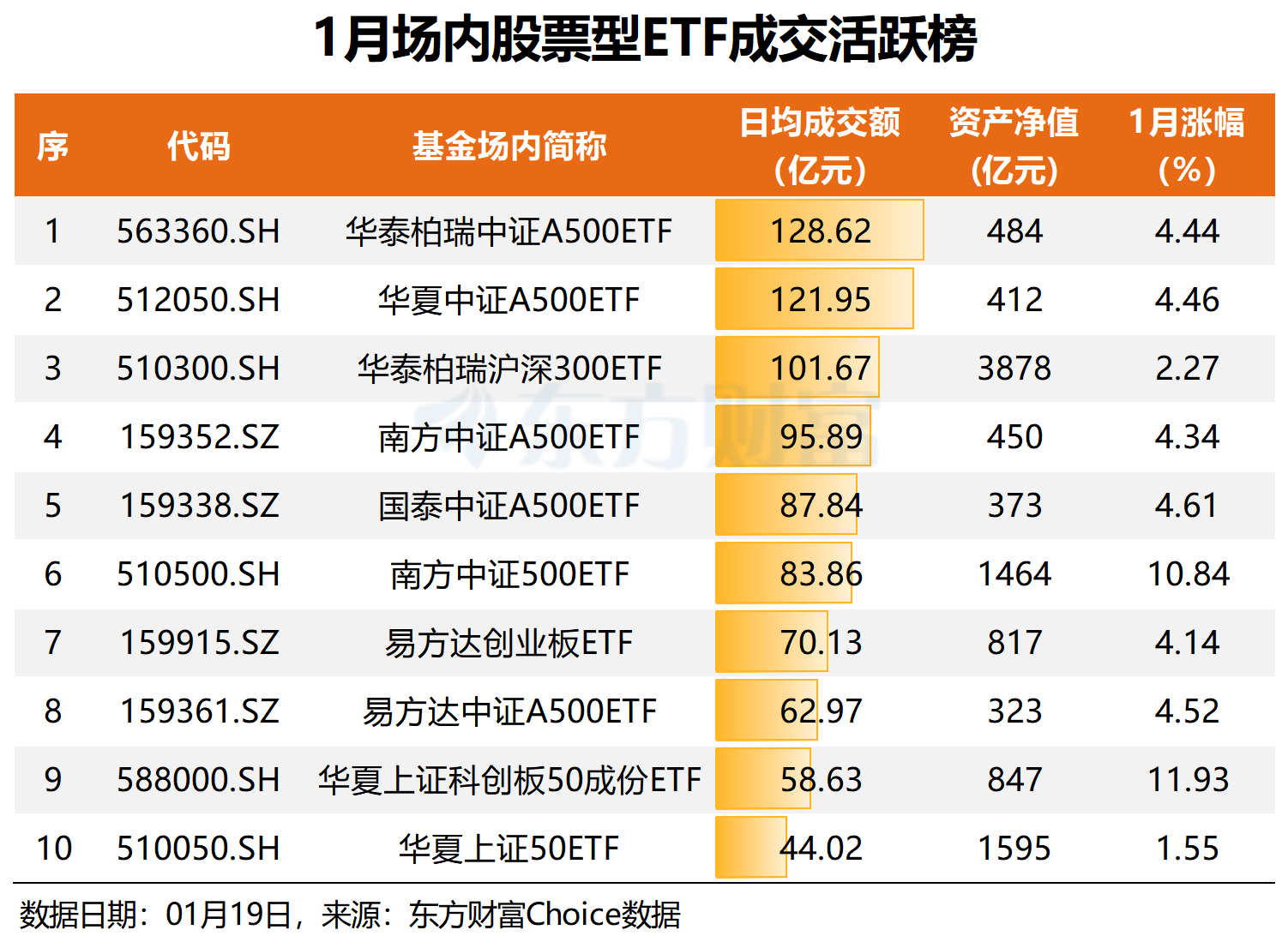 ETF市场成交量也逐步放大,并在近期创下历史新高。据东方财富Choice数据,截至1月19日,当月ETF市场日均成交5738亿元,日均成交额相较上年同期增超3500亿元,同比暴增159%。其中,股票ETF日均成交2253亿元,同比增超1300亿元。